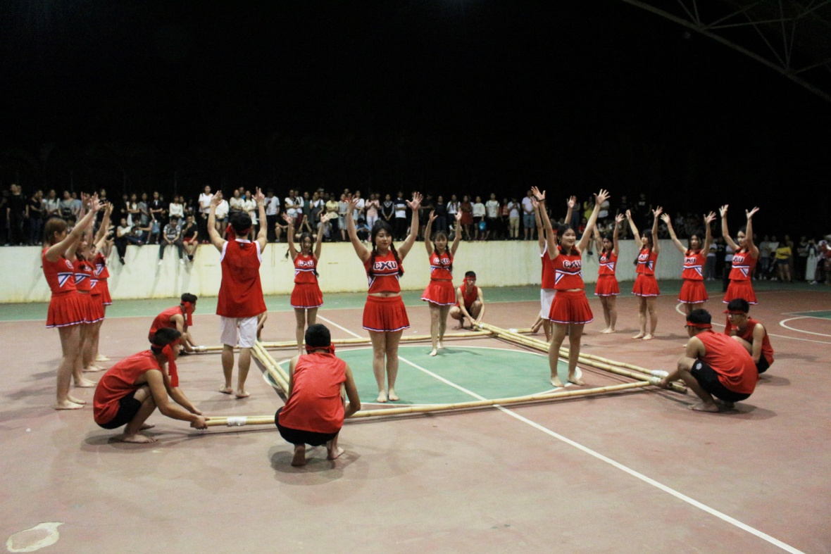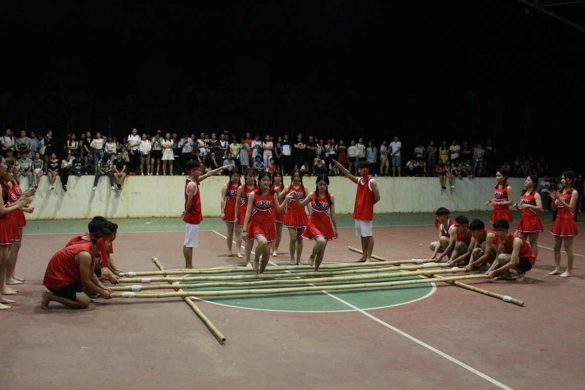 竹竿舞,又称竹杠舞,有坐、蹲、站三个姿势,在有节奏和规律的敲击声中,跳舞者要在竹竿分离的瞬间,敏捷且优美的作出各种动作。在一对对舞者跳出竹竿时,持杆者会喊出“嘿,呵嘿”,现场各亲友团的欢呼声尤为激烈。其中,我院以校园风为主,弘扬热情、奔放。为我们展示了一场充满活力与激情的表演,竹竿在地上起落,他们在竹竿之间跳跃,每个人都把自己的风采展示在了舞台上,我院参赛队伍之间的表演配合度极高,花样多样,充分展示了男女间敲竹杠传情的情义,带给了在场观众一场视觉盛宴,也表现出对这次比赛的重视。