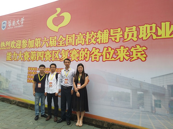 4月13-14日,由教育部思想政治工作司指导,中国高教学会辅导员研究会主办,中共海南省委教育工委、海南省教育厅承办,海南大学协办的第六届全国高校辅导员职业能力大赛决赛第四赛区在海南大学举行。我院团委书记曹瑞吉、思想导师蒋正喜、张肖、肖赠赠观摩了此次比赛。