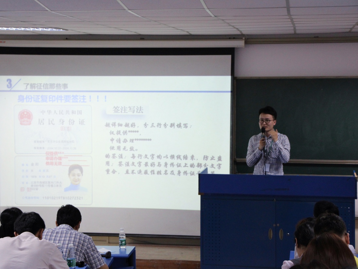 从我校毕业在民生银行工作的孙翔孙经理给大家讲的是关于个人征信对大学生的影响。他从三个方面为我们分析了个人征信问题,同时他也提到“个人征信问题对大学生们来说是十分重要的,在以后步入社会后会更明显,并希望所有人都能重视起来。”最后由国开行的陈馨女士为我们讲了关于助学贷款方面的问题。陈女士的演讲为不少在座的大学生解开了疑惑,更加清晰的了解助学贷款的贷款额度,贷款期限和申请贷款的流程。