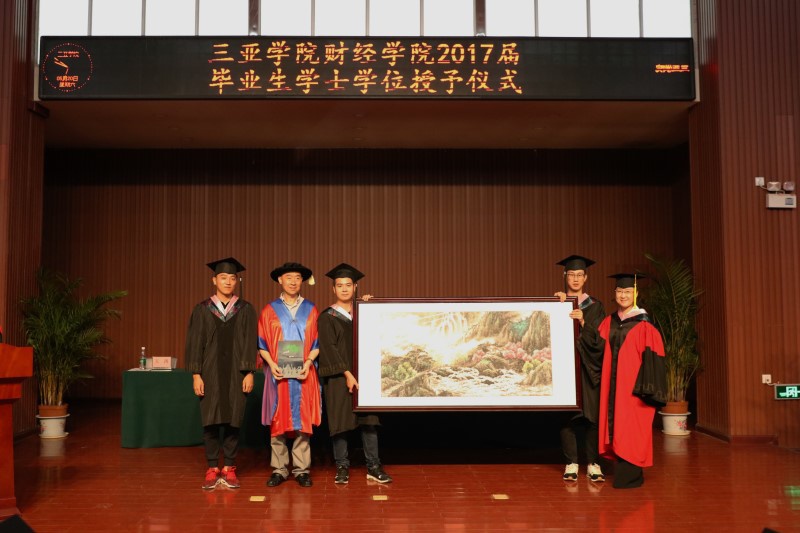 在大会的第二项内容中展示了大四学生们的收获,首先由陶宏书记宣读了这些优秀毕业生的名单。之后便进入了最令人难忘的时刻——学士学位授予环节。据悉,根据三亚学院学位评定委员会会议通过,决定对467名学生授予管理学学士,186名学生授予经济学学士。这则由在场的导师们为学生授予学位,并拍照留念。