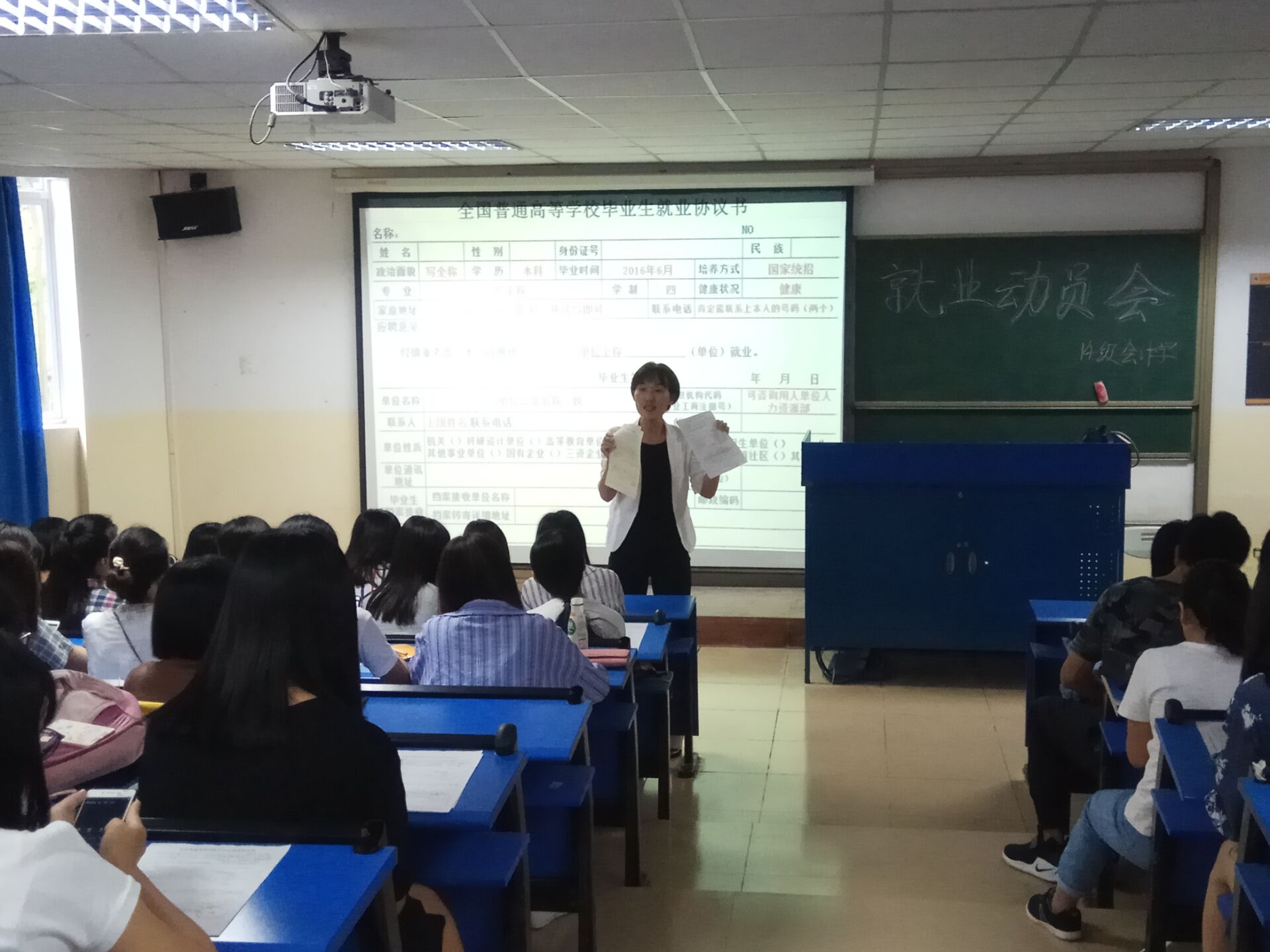 2017年11月2日下午3点,旅游会计1401班、会计1401班、会计1402班和会计专升本1601班在五西103召开了就业动员大会。此次动员大会解决了许多同学对毕业过度就业时所面临的问题。