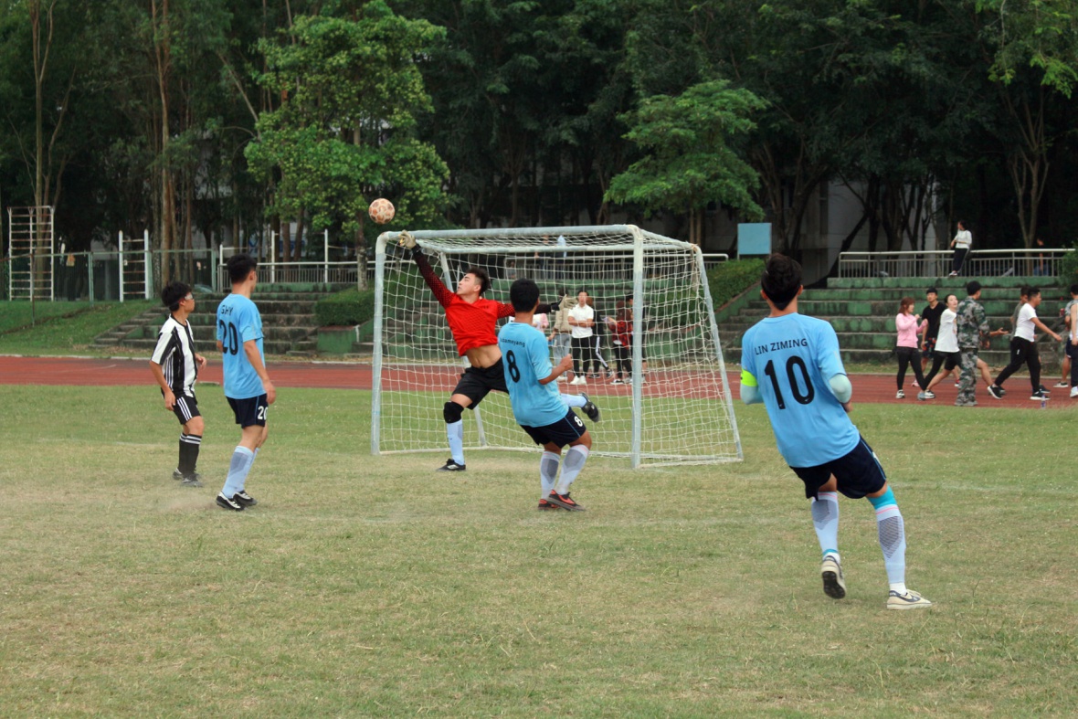 下午两点半,随着裁判一声哨响,上半场比赛正式开始。比赛由财经学院首先开球,由于队 员 们 配 合 默 契 快 速 的 传 球 ,奋 力 的 抢 球 ,随即,财经学院占据场上的控球优势,掌控了比赛的节奏,连续射中对方球门两次,但时尚学院也不甘示弱,很快展开了如潮水般的猛烈反攻,但是财经学院的守门员将几次惊险的射门都化险为夷,上半场结束,双方4:4打成平手。