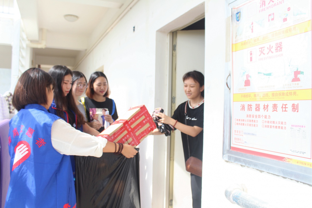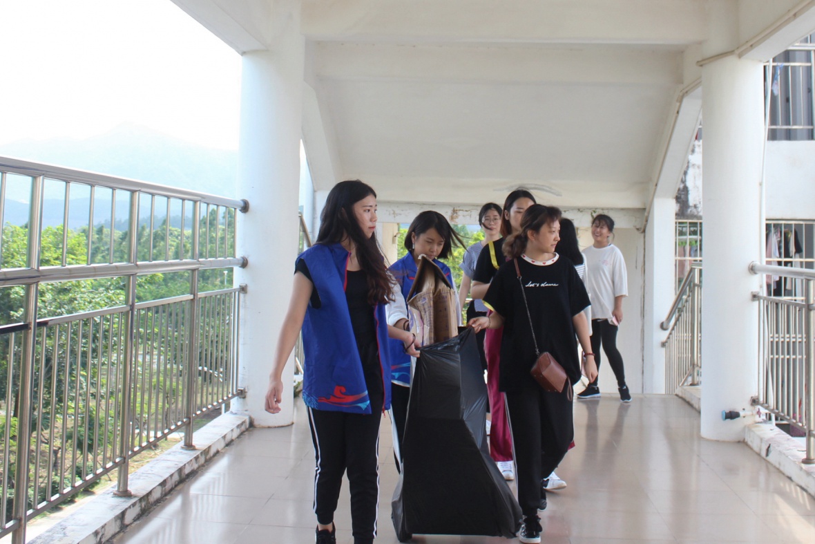 活动开始之前,准备工作做的非常顺利且非常到位。一个个可爱的志愿者们到达集合地点后开始签到并进行工作的分配,发放志愿者服装和一个大的塑料袋,之后开始对宿舍楼层进行义务回收。每一个志愿者都积极的投入到这次活动中来,他们互相帮助,互相合作。