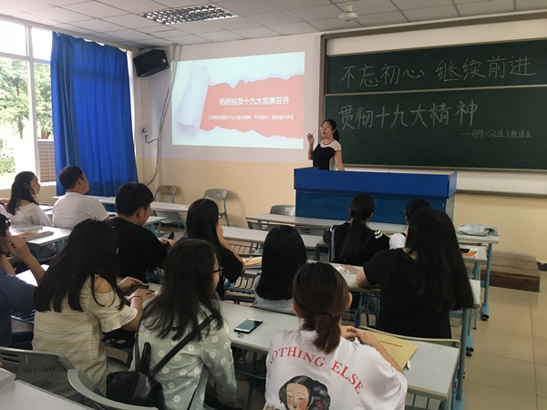 肖潇老师莅临主持本次班会并向班级同学们讲述十九大精神的精髓并且分享了自己的感受与经验,还提出要积极的发扬个人的兴趣爱好,这是青年一代有本领的一面;最后,老师提到了平时的礼貌问题,新的青年一代礼貌礼仪有所缺失,希望我们可以认识到这一点后,只要我们要勇于承认并改正,这样就能成为有担当的好青年;这次班会不仅宣传了团和十九大的精神,同学们还感受到了班级的凝聚力,都积极的参与其中,同学们要以十九大精神报告为指引,用新思想理论武装头脑,在新征程中勇担历史使命,抒写自己精彩人生华章。