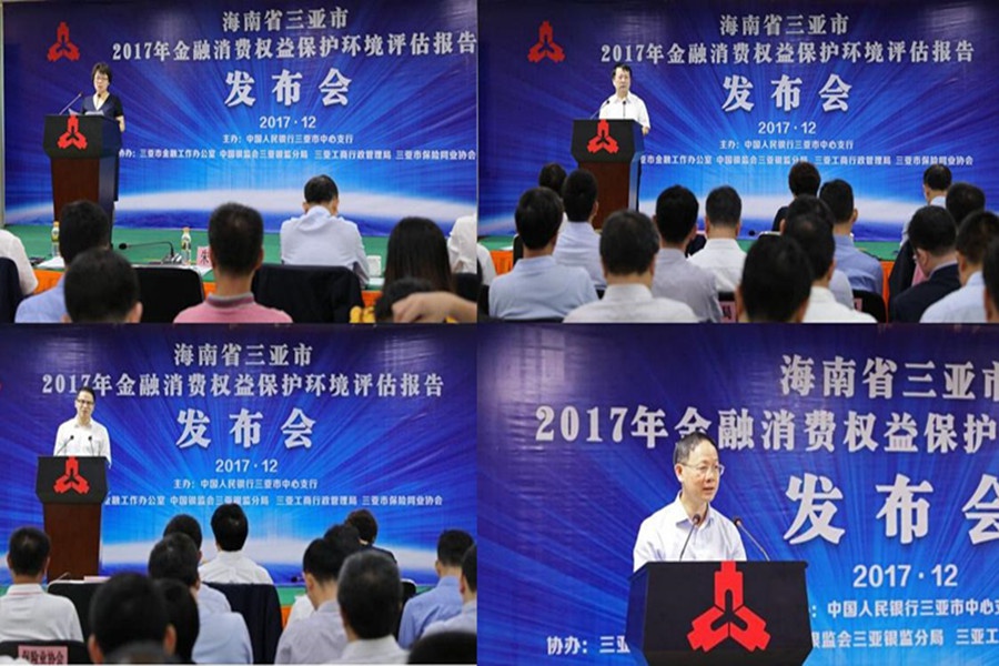 12月7月上午,中国人民银行三亚中心支行联合三亚市金融办等相关部门发布了《三亚市金融消费权益保护环境评估报告(2017)》。中国人民银行总行消保局副巡视员朱红出席发布会并致辞,三亚市政府副市长戴玉明到会祝贺,海口中心支行党委委员、工会主任吴道义、消保处处长罗实等领导以及三亚金融系统、政府相关部门负责人共120余人参加发布会。三亚学院财经学院副院长高一兰受邀出席。此次发布会由中国人民银行三亚中心支行行长许可主持。