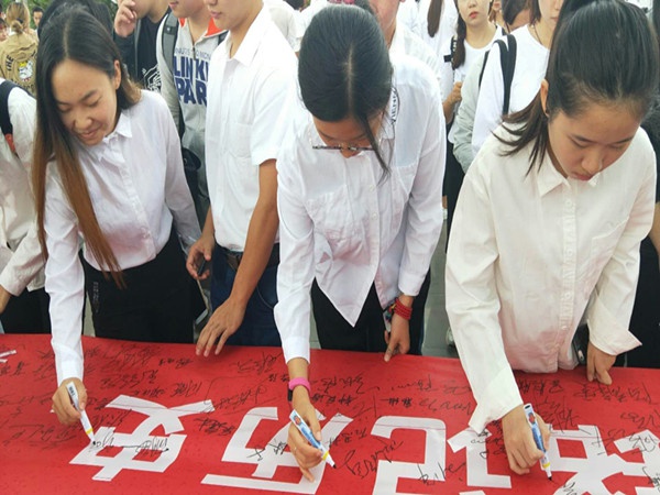 活动开始,全体肃立为南京大屠杀遇难同胞们默哀一分钟。随后学生代表孙可拉同学发言。她提到:“以古为鉴,可知新替”,我们要在铭记历史的同时,砥砺前行,兴创未来。用我们的智慧和勇气扬起理想的风帆!用我们的热血和青春谱写出前不负于古人,后无愧于千秋万代的历史新篇章!活动最后,全体师生在“铭记历史,共筑中国梦。勿忘国耻,传承中华魂”的十米卷幅上签名留文,缅怀在南京大屠杀中逝世的无辜遇难同胞,并写下对和平的祈愿。