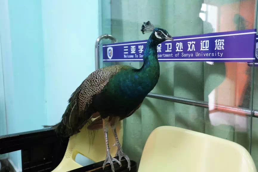 (财经通讯社 讯)2018年3月6日6点时分,一只野生孔雀无意中飞到三亚学院北区北25寝室楼下草坪上,为确保孔雀的饮食及安全,目击者来自北25-313的苏新杰同学及其舍友联合隔壁寝室314的4名同学成功捕获孔雀并移交至保卫处。经了解,因天色已晚,这只孔雀在保卫处度过一晚,于第二天一早移交至林业局。