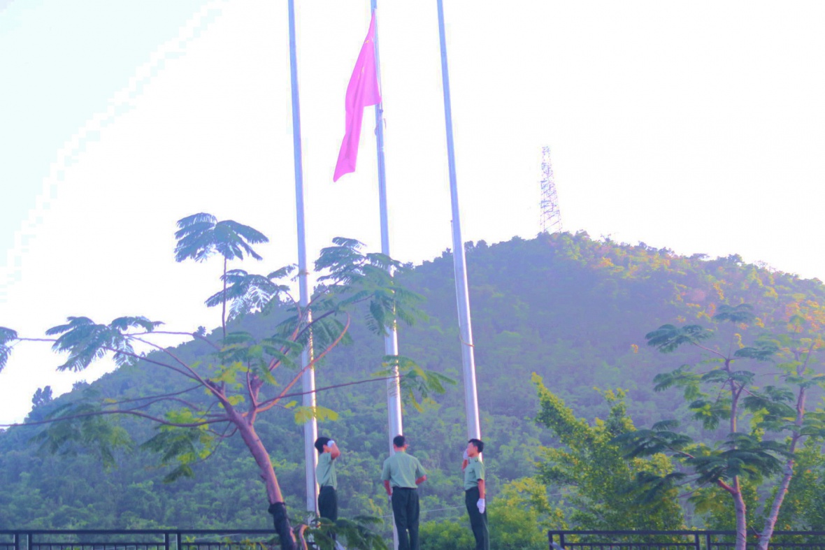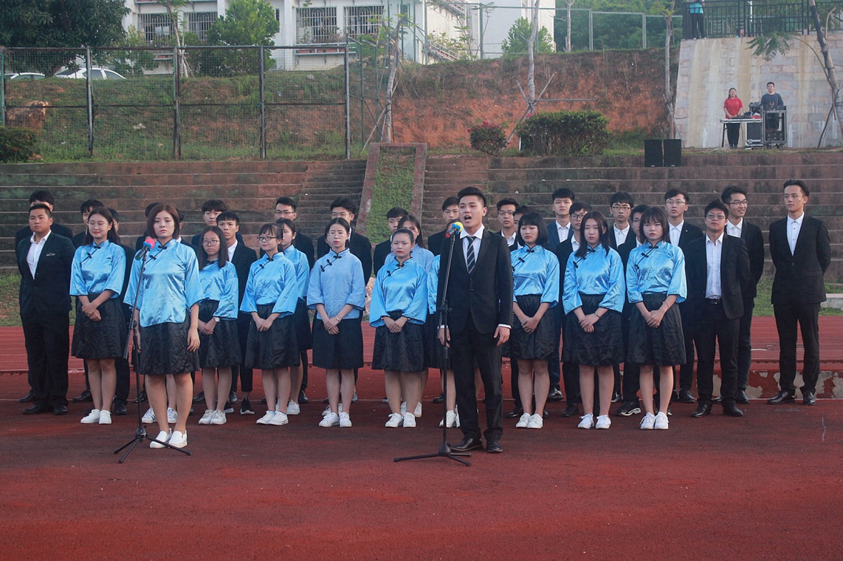大会首先进行第一项:升国旗 奏国歌。伴着国歌响起,升旗手振臂一挥,老师和同学们肃然起敬,行着注目礼,看五星红旗在激昂的音乐声中缓缓上升。接下来,由学生代表管理学院的杨璐璐同学及教师代表体育学院党总书记依次做国旗下讲话,他们二位的讲话表达了对三院青年人的期望,以及在在新时代背景下,发挥我们大学生的积极作用,成为时代的有为青年。大会第四项,在音乐学院管弦乐队和合唱团的带领下,大家一起热情澎湃地齐声合唱《歌唱祖国》,“五星红旗迎风飘扬,胜利歌声多么响亮,歌唱我们亲爱的祖国,从今走向繁荣富强...”动人嘹亮的歌声洋溢了整个操场,展现了三亚学院这群青年学子的活力。最后,全场庄重宣誓:坚定信念,立鸿鹄志,求真问学,勇当尖兵,祝福我们伟大祖国繁荣昌盛。