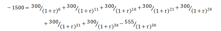 思考良久,我想用一个我在《财务管理》课堂教学中的案例,来谈谈我对金融科技的粗浅认识。从人类的第一张借条出现开始,金融一直伴随着人类,从本质上说,金融涉及不同时点上的现金流(Cash Flow)的交换。以借贷举例,债权人以今天的本金出借,换取债务人的定期利息支付以及债务到期时的本金偿还。对一个投资项目的分析,有助于我们更进一步理解金融及金融与科技的关系:某制造公司目前只有一个开发项目,项目生命周期36个月,初始投资1500万元,从第6个月开始,每5个月回收300万元现金,项目结束时,还需支付555万元尾款,该公司应不应该投资该项目呢?同学们可能会想到,如果这个项目的收益率高于金融产品的收益率,则应该投资该项目。那么,如何求出该项目的收益率呢?数学好的同学不难列出等式: