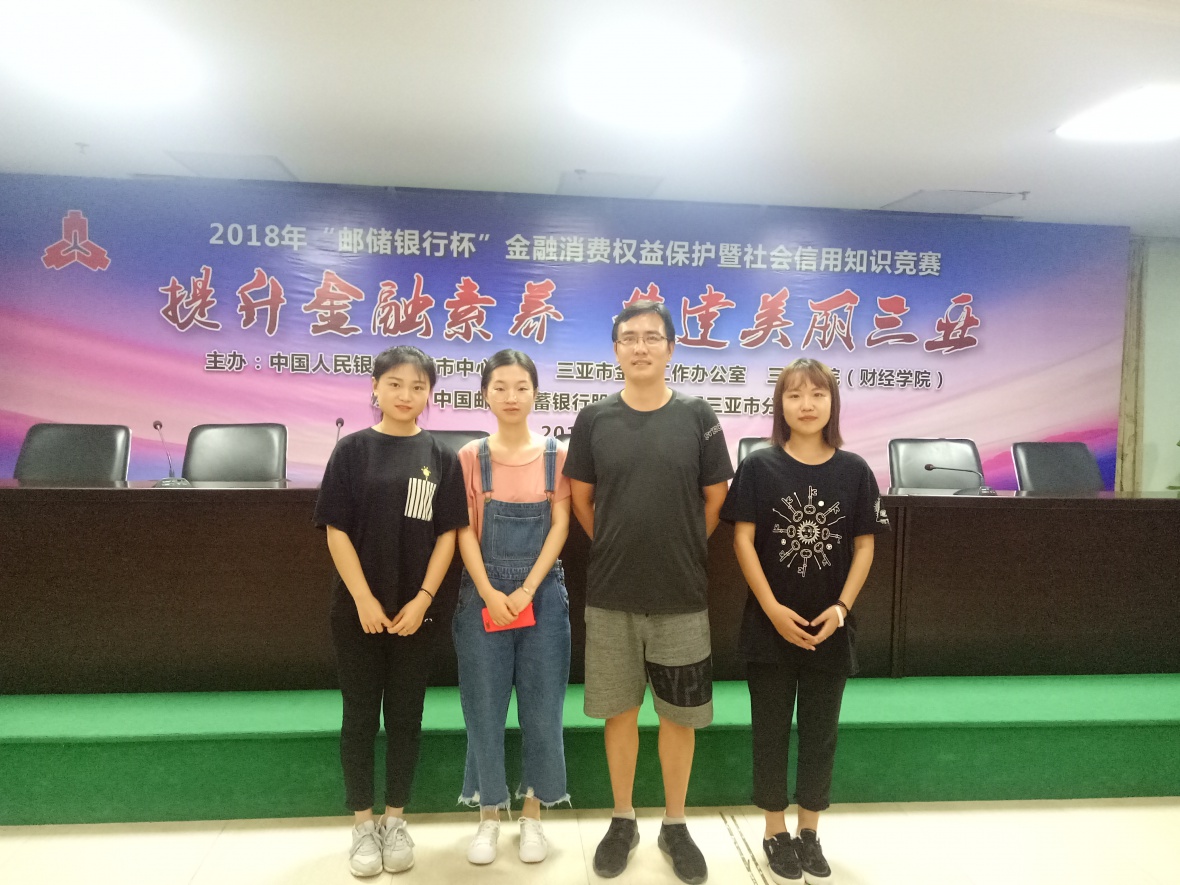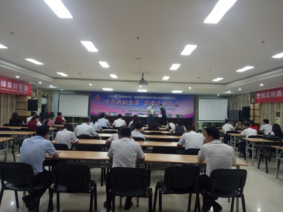 为切实增强学生金融、网络安全防范意识,帮助学生增强对有害网络借贷业务甄别、抵制能力,提升大学生金融素养,树立金融消费者保护意识,2018年9月20日晚上8点三亚学院财经学院王涛老师率学生队伍参加了与中国人民银行三亚市中心支行、三亚市金融工作办公室联合主办的2018“邮储银行杯”金融消费权益保护暨社会信用知识竞赛。