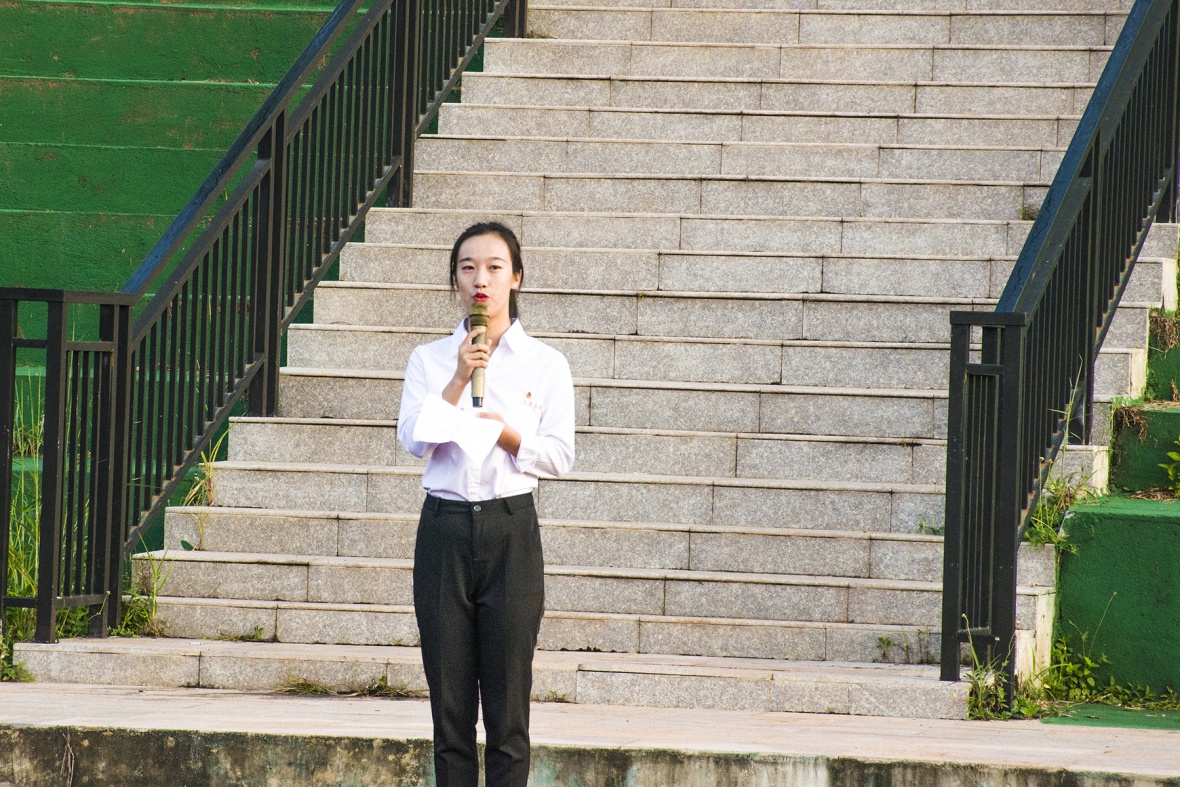 在五星红旗迎风飘扬中,曹瑞吉老师上台发表讲话。曹老师首先为同学们讲述了华中科技大学学生因学分问题从本科降为专科的事件,之后让同学们思考有关刘媛媛 “当代大学生能为祖国做什么”的问题,以此来告诫同学们:大学混日子的时代终将结束。