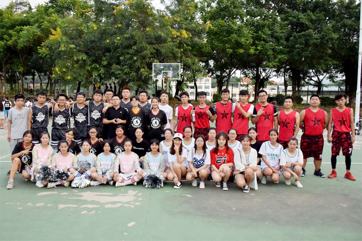 图为两班篮球队和啦啦队队员合影