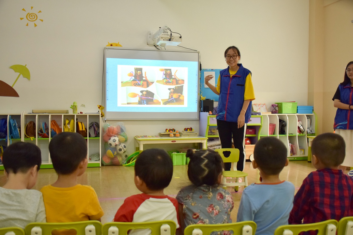 做好准备工作后,课堂正式开始。其中一位志愿者首先向小朋友们提问了他们对幼儿园的印象、在幼儿园的趣事。小朋友们踊跃发言,现场一片欢腾。