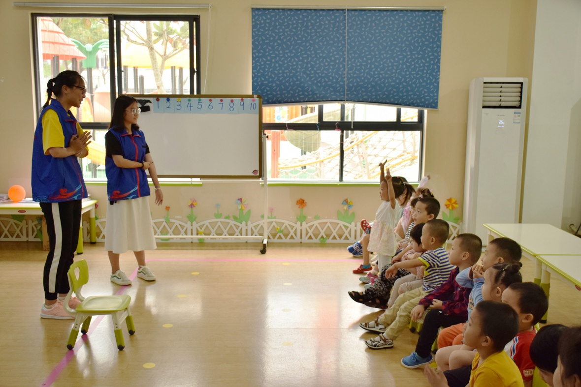 下午4点,志愿者们在校门口集合,随即前往三亚学院附属幼儿园。尽管天气闷热,但看到小朋友们脸上灿烂的笑容,听见稚嫩的欢迎声,志愿者们如春风拂过,脸上的疲倦一扫而空。
