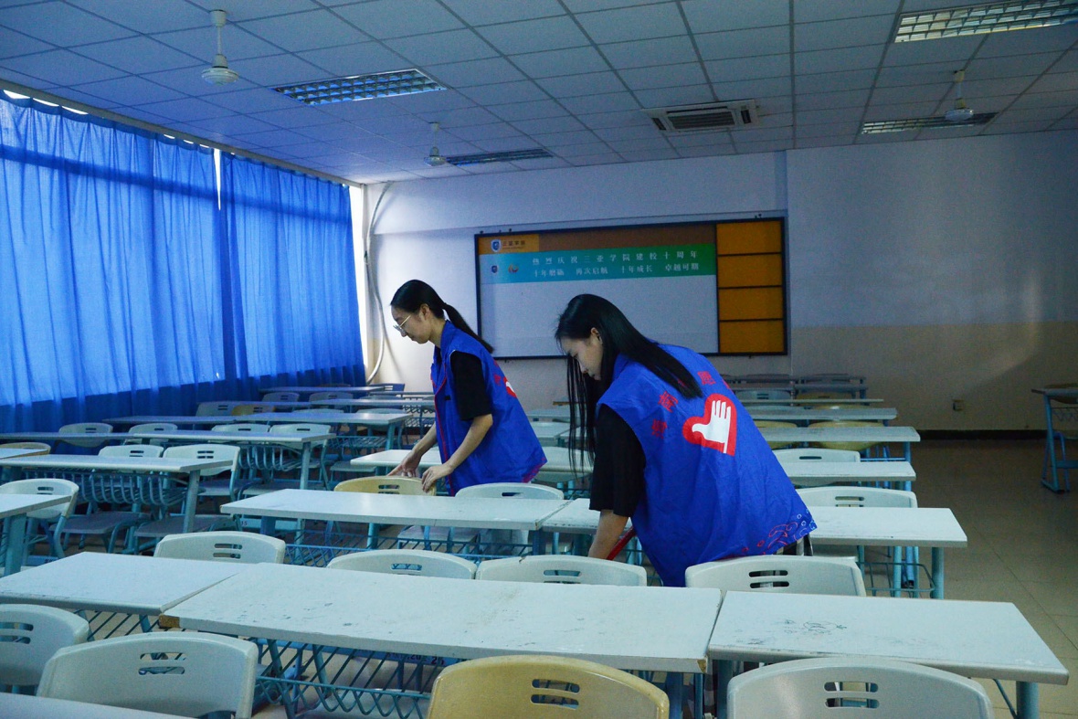 财经青协的带队人将志愿者们分成若干组,来到指定的教室进行清扫和整理。进入教室后的志愿者们分工合作,有的清扫地面垃圾,有的整理桌椅,干得热火朝天。经过志愿者们不懈的努力,整个教室显得整洁、明亮。挥汗如雨的志愿者们,看到自己的劳动成果后,也露出了笑容。