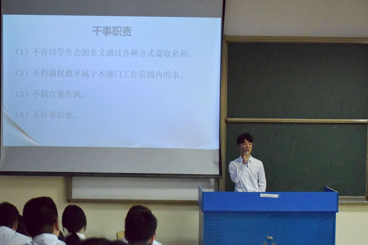 本次培训,学生会各部门的负责人都精心准备,给所有的干事上了精彩而有意义的一课。培训会上,主席团成员将自己的工作经验、见解和想法如实细致地讲解给各部门干事。办公室、学习部、宣传部、女生部、体育部、文艺部、外联部以及自律委员会分别向干事们介绍了自己部门的主要职责,办公室主要负责各部门之间的沟通交流,宣传部主要负责学院各个大小活动的宣传,体育部主要负责学院内体育活动的相关事宜,外联部负责为各个活动拉赞助等。
