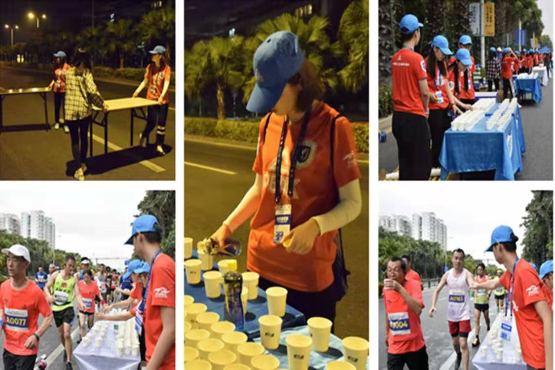 凌晨3点30分,我院99名同学在两位老师的带领下,准时在喷泉广场集合,坐上大巴车,前往比赛现场参与志愿者服务工作。本次比赛,我院共管理两个服务点:5km处与7.5km处。到达现场之后,志愿者们开始了紧锣密鼓的布置,搬桌子、撑帐篷、摆放饮品等。比赛过程中,志愿者们不仅为参赛者们提供饮品,还为他们喝彩加油。比赛结束后,志愿者们协助清洁工清理补给站周围的垃圾,并将帐篷、桌子等收起放回指定位置,将场地恢复原状。