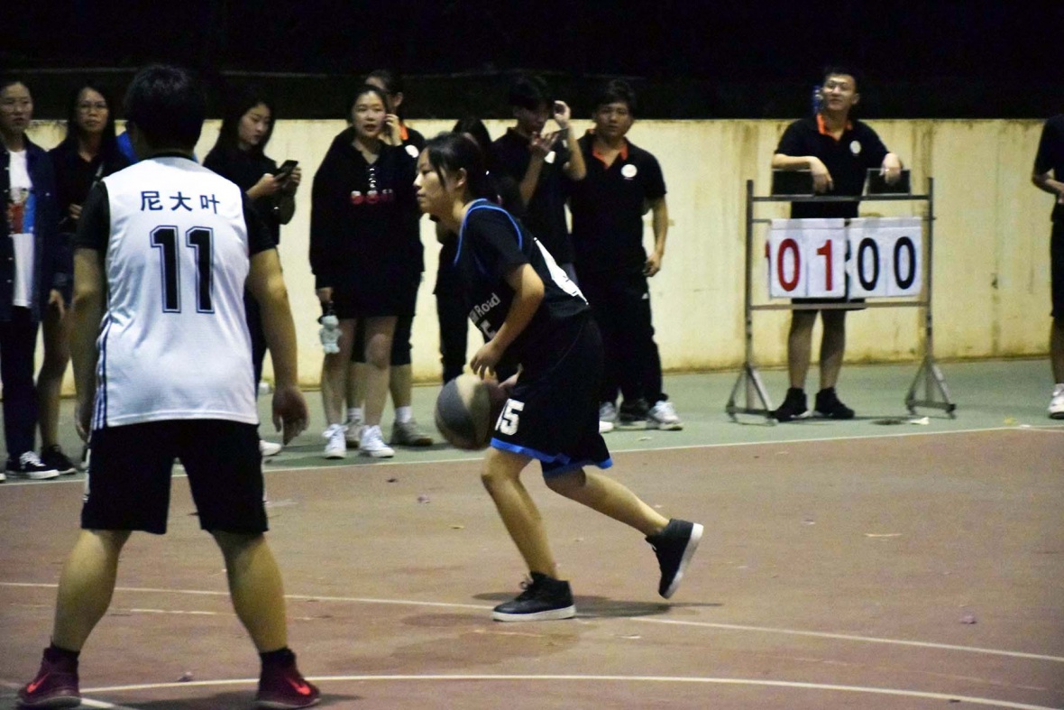 首先进行的是女篮比赛。比赛开始之前,双方运动员在紧张地做着热身运动。现场气氛火爆,队员在灯光下,舞动着矫健的身姿。传球、上篮、得分一气呵成,每一次进球都能引爆全场。经过激烈的角逐厮杀,最终财经学院以12:1的比分战胜丝路商学院,展现了巾帼不让须眉的风采。