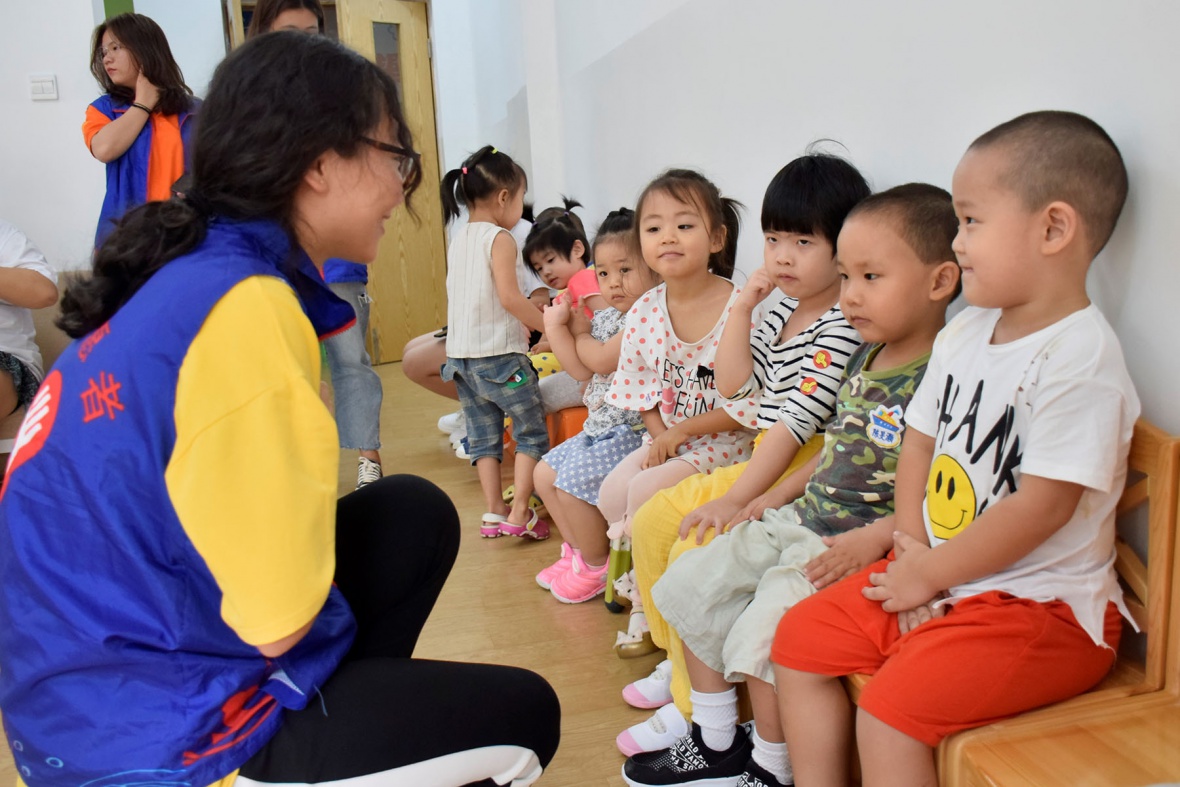 图为志愿者在与小朋友们进行友好的交谈