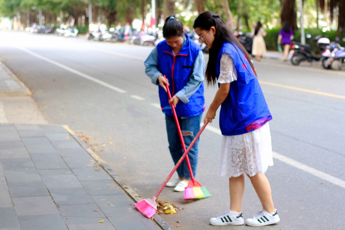 图为志愿者们进行绿色天使校园美化活动
