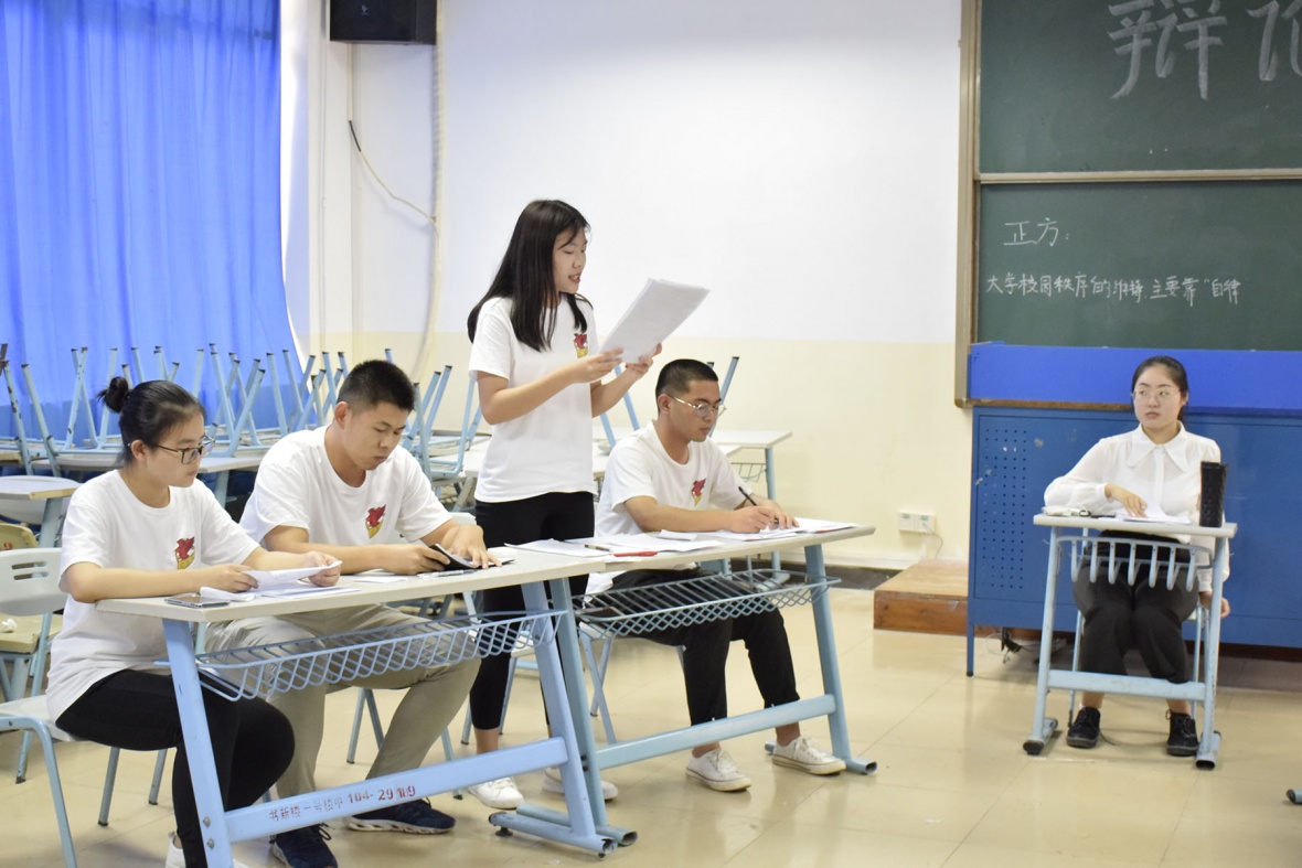 首先出场的是国贸1802班与会计1805班,他们的辩题是“开放式的管理对大学生是利大于弊还是弊大于利”。从驳论,对辩,盘问等环节中可以看出,双方辩手们在赛前都已做好充足的准备。随着比赛的持续进行,正反方的唇枪舌剑让现场充满了火药味。整场比赛紧张而激烈,有序而不失活力。