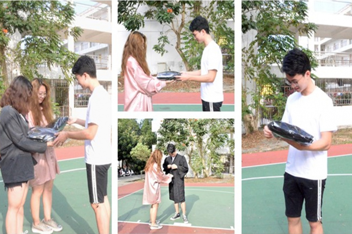 志愿者们将学士服领回宿舍进行清洗,宿舍栏外一排排迎风飘扬的学士服,四角分明、带着金色流苏的学士帽,如一只只待飞的鸟,那是即将毕业学长学姐们的剪影。志愿者们将学士服晒干装好入袋,亲手交给对应的学长学姐们,衣服散发的清香是学妹学弟们对学长学姐们的衷心祝福。