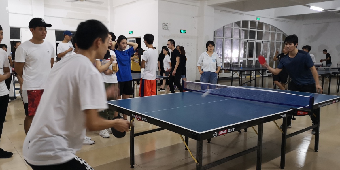 活动开场,全体参赛人员集合,认真听老师讲解比赛规则。四个班每个班各派五名选手,代表班级参赛,形成一个团体和其他班级轮流进行PK,每个人打3场,不限时比赛,拿满十一颗球即为胜利一方。比赛采取自愿参与、公平公开公正的原则,用石头剪刀布的方式决定发球权,四个班各派裁判一名,进行观战裁夺,并登记每轮得分情况,得分由参赛分和观众分共同参考计算,观众最多的班级加一分。比赛正式开始,伴随着乒乓球撞击球板的声音、鞋子快速移动摩擦地面的声音、场外观众此起彼伏的尖叫声,在几十平米的空间内,比赛一次次的进入高潮,每位选手都在为班级荣誉拼尽全力。在三轮比赛过后高峰对决来了,6班赛赢了10局,由于观众人数最多得到了11分成绩,与7班胜11局得分拉平了!这时候需要各队再派出一名选手进行pk对决!此时天色已晚,准备离场的观众也驻足了脚步又回到赛场周围,派出的队员也实力相当不相伯仲,加上是为班级荣誉而战,每一次发球和接球都屏气凝神,比分节节攀咬、你追我赶,全场气氛异常紧张。最终在十比十后一球定胜负,由七班赢得冠军。