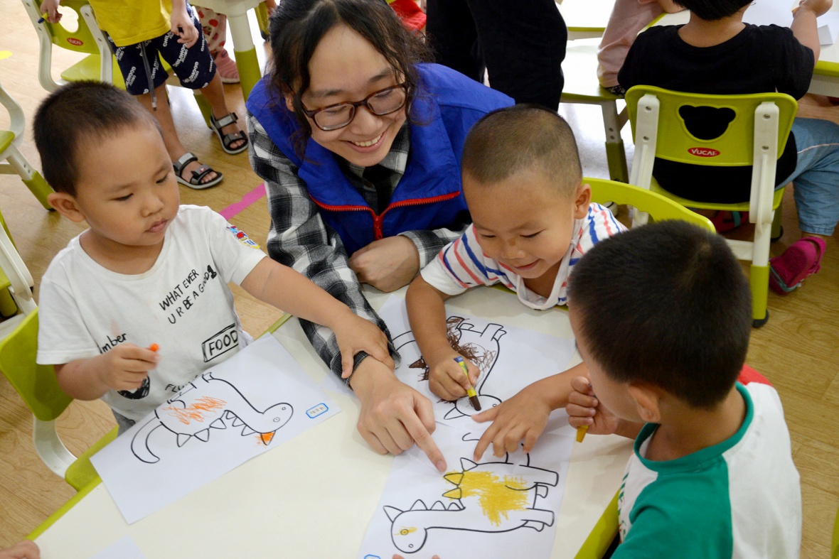 另外一边,志愿者们教芽芽班的小朋友们认识恐龙。小朋友们在志愿者们的带领下,通过短视频了解了一些恐龙知识。之后,小朋友们拿起手中的画笔,给志愿者们准备好的恐龙涂上颜色,这拓展了小朋友们的知识面,提高的他们的专注力和想象力。