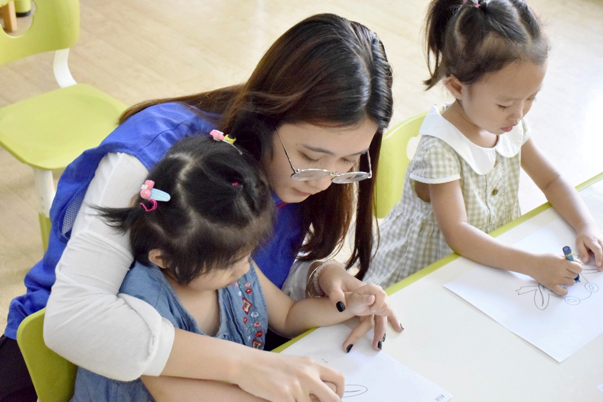 图为志愿者教小朋友为青蛙上色