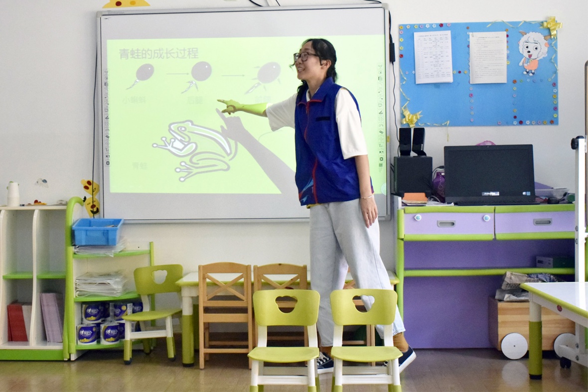 图为志愿者们通过PPT让小朋友们了解青蛙