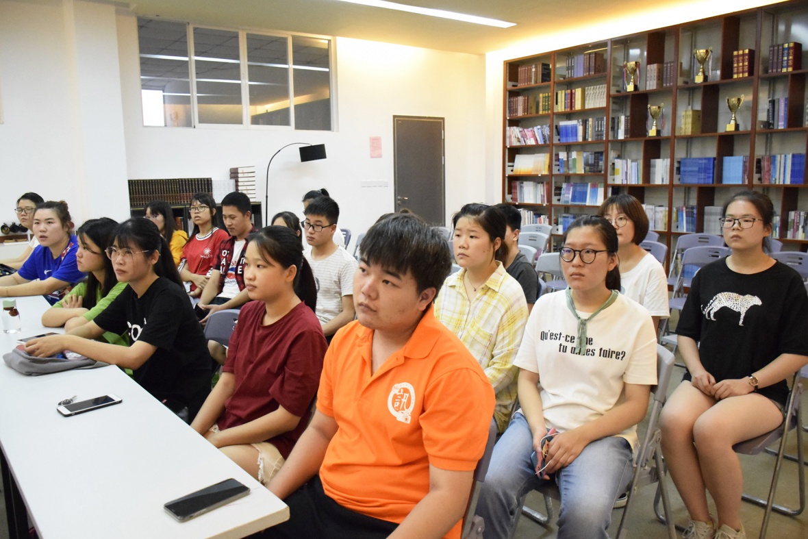 在观看视频前,张光院长首先组织同学们观看了一个有关英语发音的短视频。观看结束后,张光院长强调音标在学好英语中的重要性,同时提到要学好英文就要不断锻炼自己的听力,备上一本词典可以及时解惑。
