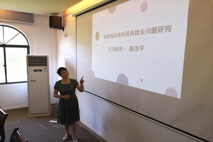 聂洁平老师首先向大家介绍了本次学术报告的研究背景:近20年来,海南省由特区建设转为国际旅游岛开发、目前又在设计海南自贸港的宏伟蓝图。岛内的公共设施建设,大量的房地产开发和与其配套的商服、休闲馆所等建设,这些由城市的不断扩张带来了大量的土地需求。为满足这些建设用地,海南省政府的主要办法就是从农民手中买回他们拥有且世代赖以生存的山林、土地、宅基地等。选择海南省失去土地农民的再就业问题研究这样一个题目,旨在探讨如何提升这一群体的就业能力,不能只是目前的去做保安和保洁简单的就业方式。怎么做才能加快完成从农民到城市居民的转变,成为自由贸易港实施必须依靠的庞大群体。