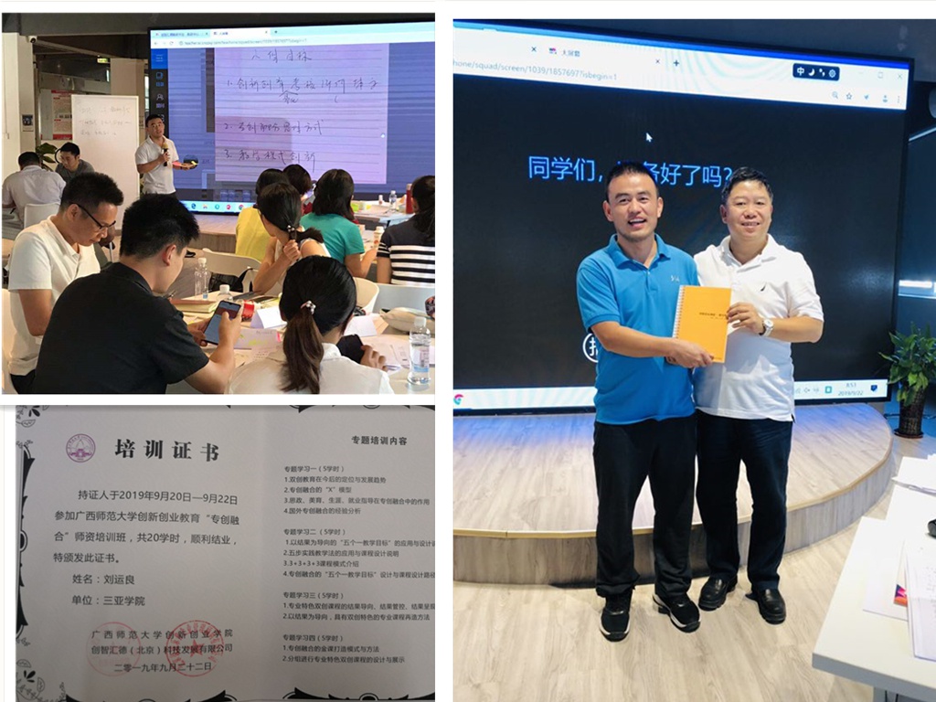 2019年9月20-22日,我院刘运良老师与其他学院四位老师共同参加了在广西师范大学举办的“专创融合师资培训班”。培训主讲老师是首都经贸大学人力资源开发与管理中心客座研究员、国家服务外包人力资源研究院顾问、创智汇德(北京)科技发展有限公司总经理,国家创新创业的评委谢强老师,参加培训的有三亚学院、广西师范大学、广西大学等高校。