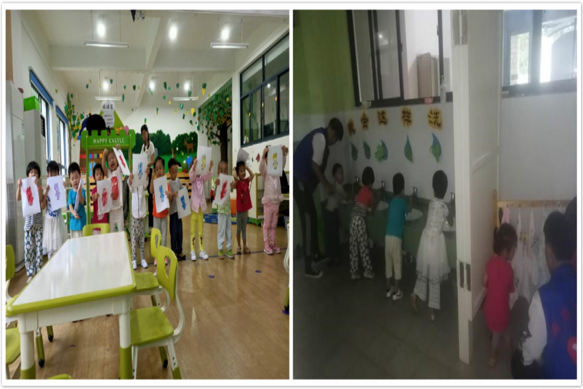 表演完后,志愿者将准备好印着主角的卡片发给小朋友们,芽芽一班的小朋友们给小猪佩奇画出自己喜欢的样子,创作出自己独一无二的新形象。芽芽二班的小朋友们则是给佩奇的爸爸妈妈和弟弟涂上喜欢的颜色,画上新的衣服。苗苗一班的小朋友们用颜色来猜角色,给海绵宝宝换衣服,给派大星画上衣和给章鱼哥设计新的鞋子。在涂完颜色后,志愿者们领着小朋友们到了洗手台边,帮着每一个小朋友将手洗干净,让小朋友们养成爱护好个人卫生的好习惯。