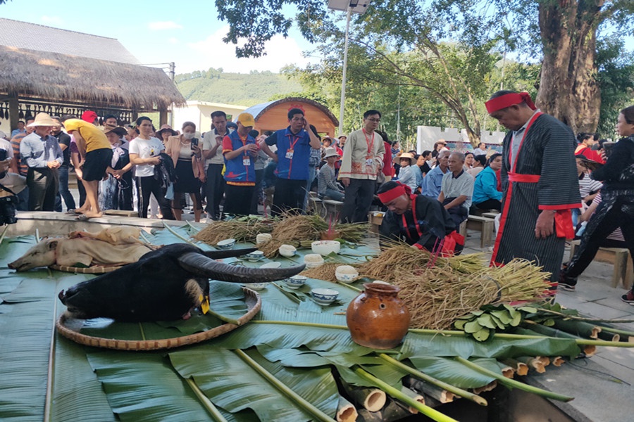 在白沙青松乡拥处村的半山腰,湛蓝天空下,苍翠群山间,放眼望去,漫山遍野都是金黄色的山兰稻,山风吹起稻浪,山谷一片稻香,又是一年山兰丰收时。稻穗金黄,粒粒归仓。在半山腰处的山兰稻园里,活动主办方沿袭当地习俗,举办了祭拜山神、“稻公”喊山、“稻婆”祈福等仪式;随后,《稻上金秋》劳作歌舞实景演出将黎族源远流长的山兰农耕文化逐一呈现;紧接着,竹木器乐《黎乐传情》、《黎寨欢歌》演奏、群舞《种山栏》等一系列精彩节目轮番上演,让远道而来的宾客感受到了黎族民俗文化的独特魅力。为增加活动的体验性,活动主办方还安排宾客在山兰稻田里体验收割、捆稻等劳作,切身感受黎族同胞的种植辛劳与丰收喜悦。“啦奥门”现已成为白沙县级非物质文化遗产,并着手申报省级非遗。在这样的大背景下,白沙今年也正式将“啦奥门”丰收节升级成为山兰文化节。