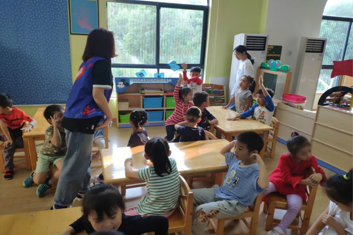 图为小朋友在课堂上与志愿者踊跃交流的场景