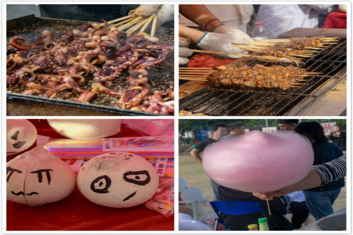 现场气氛热闹,伴随着音乐和鼓点,空气中飘着美食的香气,引得许多在同学前来一饱口福。现场有来自各个省份的特色小吃,在三亚十二月凉爽的天气里,同学们流连在美食中,欲将它们一一品尝。新疆羊肉串经过高温烹制过后撒上孜然粉和辣椒,透油焦黄,香气四溢。陕西凉皮清爽可口,火红的辣椒油更为这道美食增添了一丝火辣。