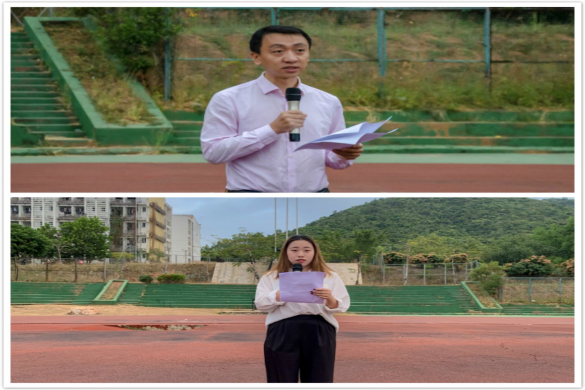 图为教师代表曹瑞吉老师和学生代表邬如琦国旗下讲话