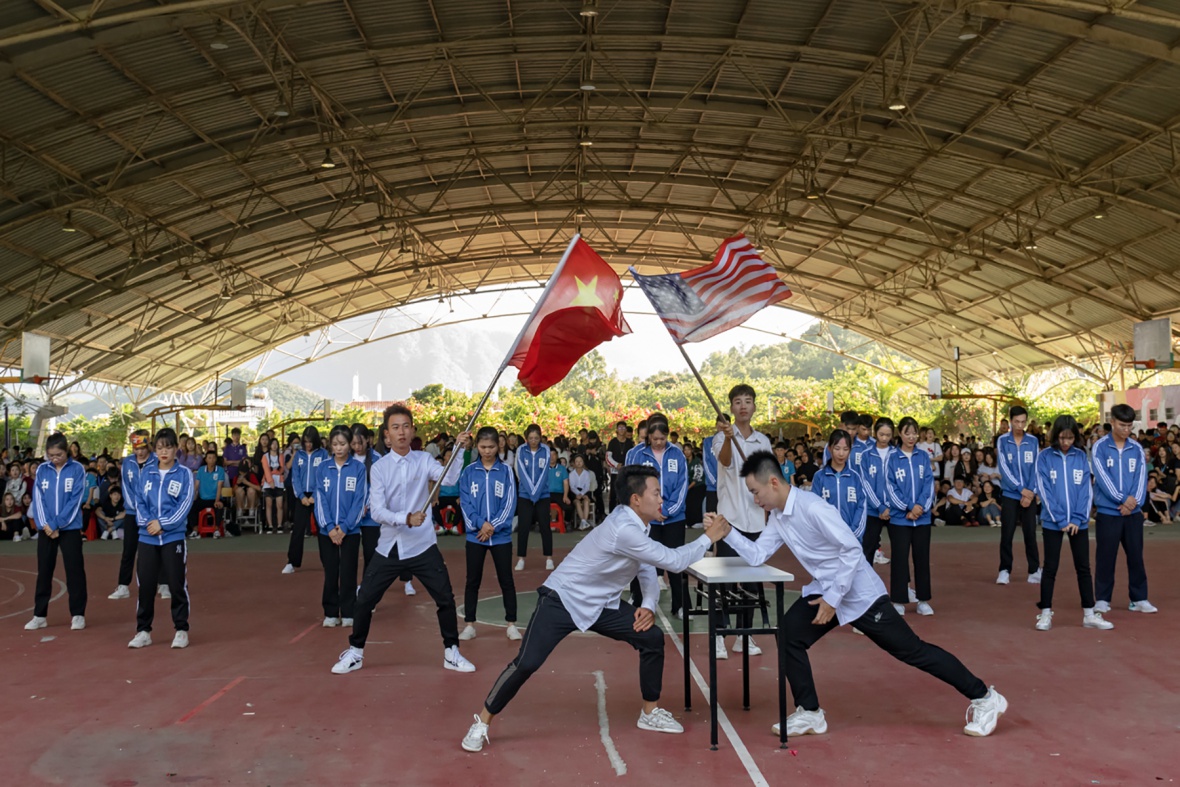 比赛开始之前,各个学院抽签决定比赛顺序。按照抽签顺序,各个学院的同学依次上场表演。新生身上蓬勃的朝气和对青春的阐释,通过舞蹈展现得淋漓尽致。财经学院以中美贸易为背景,开始了自己的表演。首先进场是中美双方洽谈商进行经济协商,势均力敌,随后通过歌曲切换,来表达事情的经过。最终,中美双方达成协议,“合作共赢,创造未来”。表演完后现场响起了热烈的掌声,足以说明表演的精彩程度。新生们穿戴整齐,脸上挂着自信的笑容。随着音乐的开始,他们渐渐放开动作,跟着节奏舞蹈。在完成所有动作后,财经学院以响亮口号声结束了本次表演。整场表演极具观赏性,财院同学们的努力和付出,获得了全场络绎不绝的掌声。