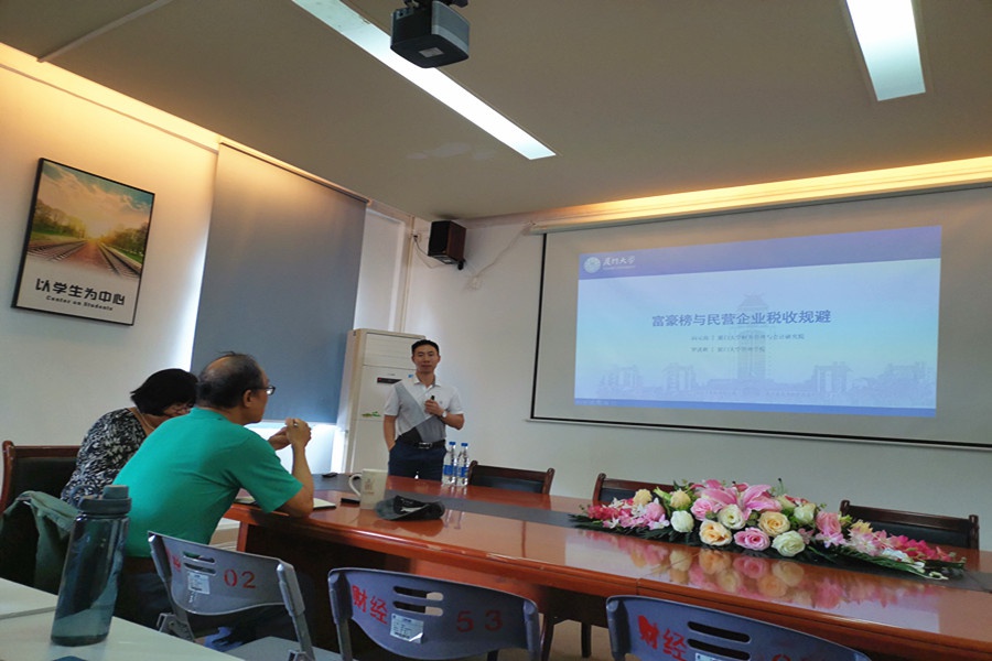 第二场讲座的主讲人是来自厦门大学管理学院的罗进辉教授,他主讲的题目是:《富豪榜与民营企业税收规避》。一看讲座的题目,就很吸引人,这也是李老师参加次场讲座的原因之一。在讲座的过程中,罗教授从研究背景——富豪榜引出了要做的论文题目,并介绍了从公司、投资者、审计师等角度跟富豪榜相关的文献回顾,接着介绍了论文题目的相关假设,进而引出论文的假设:企业家登上富豪榜后,企业的避税程度会降低。为了证明该假设,罗教授跟我们详细分享了样本来源与数据选取、变量定义与模型设定(双重差分模型)、平行趋势检验、PSM—DID多元回归分析结果以及稳健型检验,并用模型对论文做了进一步的分析,包括新闻媒体关注度、地区税收征管程度、政治关联、上榜名次与富豪榜效应。检验结果也验证了之前提出的假设。