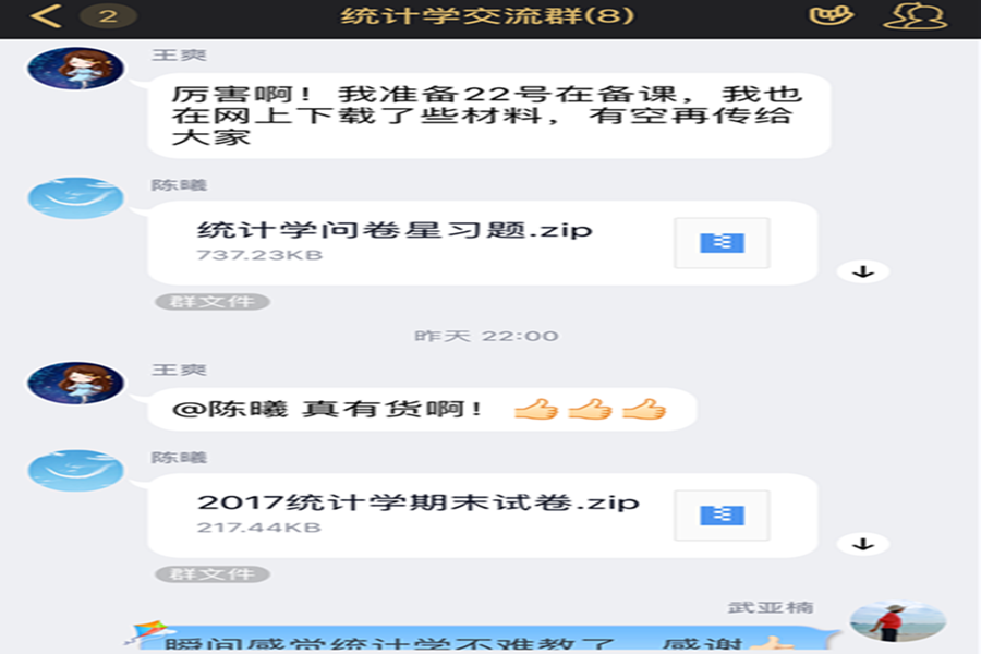 该群主要用于各位老师统计学课程课前备课、线上授课、线下辅导中统计知识和教学经验的交流、分享和探讨。陈曦老师具有丰富的统计学教学经验和参与学校课程三度建设的丰硕资源,建群之后慷慨的向群成员分享了自身参与课程三度建设的教学文档、海量题库和视频资源;储海林老师作为统计学教学的资深前辈,也第一时间向群成员分享了数本非常实用的统计软件(SPSS)的操作手册和统计知识在现实生活的应用案例(电子版),这都对疫情期间学生线下参考和线上实操提供了保障。