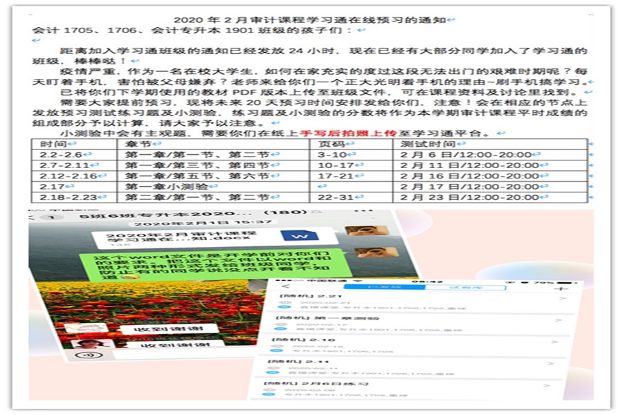 《审计学》课程是会计专业大三下学期开设的专业核心课,是会计专业最难理解的核心课之一,疫情突然爆发以后,针对疫情可能对下学期教学课程的影响,利用已经熟知的学习通教学平台,我院教师王一帆从2月1日开始便组织班级同学加入学习通班级、发放电子版教学资料、制定并发放假期预习计划、进行阶段性预习测试、章节测验等。