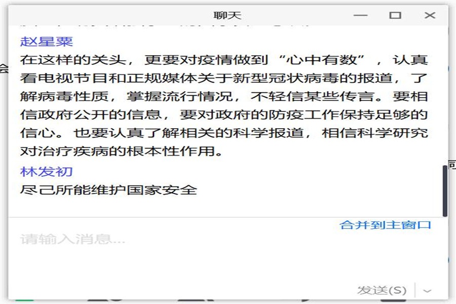 会议最后,范维澄院士围绕“面对疫情,大学生如何做”的主题进行讲解。作为当代大学生的我们,应做好日常的自我与家庭预防,利用假期提升自我,调节心理,增强对信息辨识能力,做到不传谣不造谣。本次公开课对同学们有着积极的影响,对国家安全有了更深刻的了解。