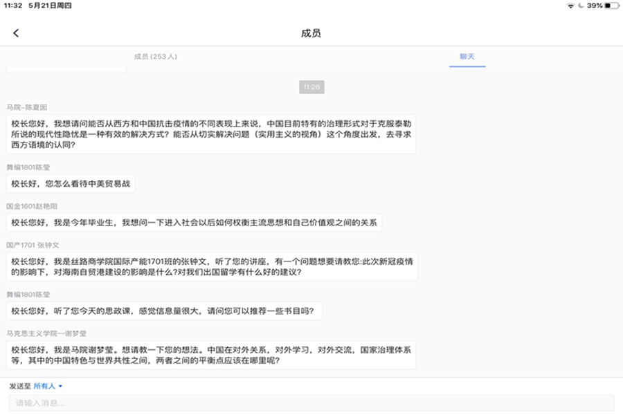 在提问环节,针对同学和老师们提出的问题,陆校长呼吁同学们不要被网上言论“带节奏”,要有自己的理性思维,做好自己,努力学习。对于海南自贸港建设,陆校长表示因为疫情原因,自贸港的建设势必会受到一些影响,但从长远角度看,自贸港的建设利大于弊。最后,陆校长为毕业生送上祝福,祝愿他们珍惜当下,在未来的日子里利用自己的优势,为中国的发展做出贡献。