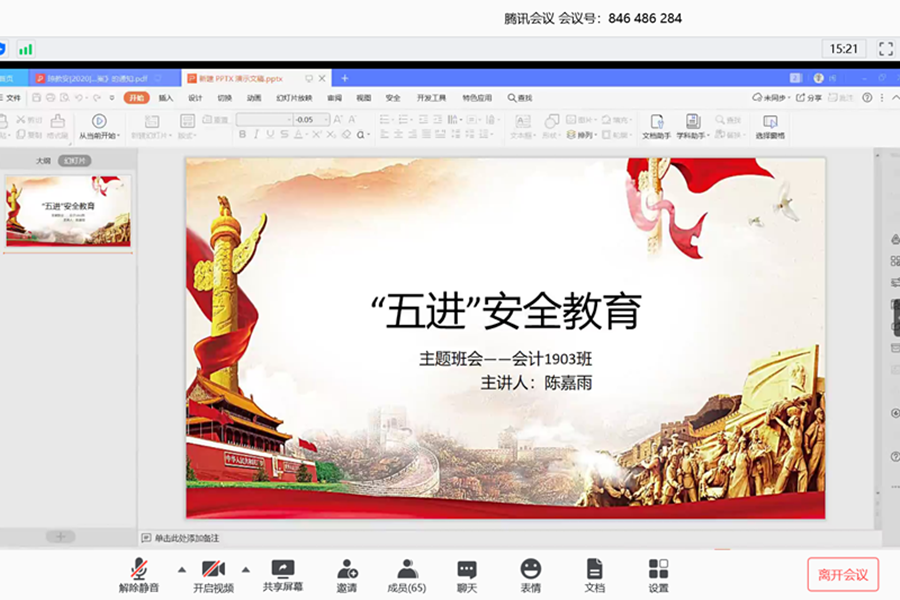 6月2日下午13:00时,会计1903班团支书利用午休时间在腾讯会议召开了有关“五进”的安全教育主题班会。