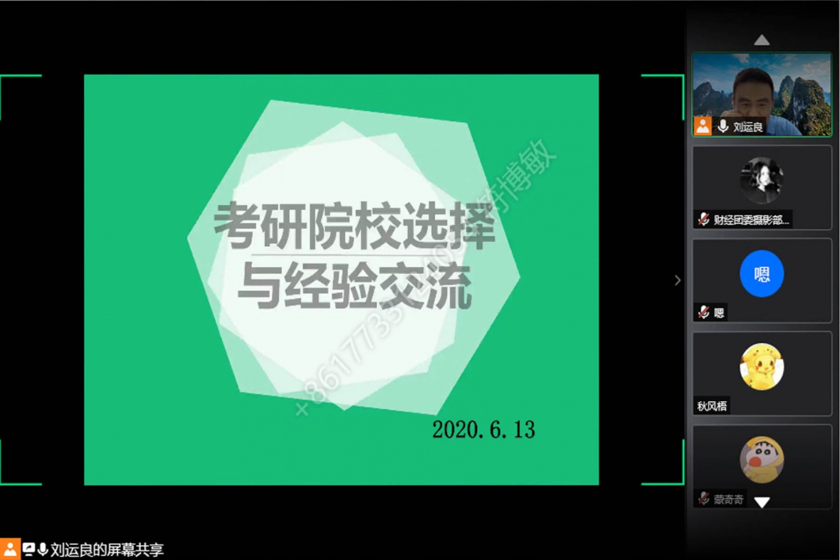 (财经团委 讯)2020年6月13日19:30,财经学院在腾讯会议开展了一场线上考研备战经验交流会。参加本次会议的人有财经学院刘运良老师和今年考研成功的两位学姐以及备战考研的同学们。