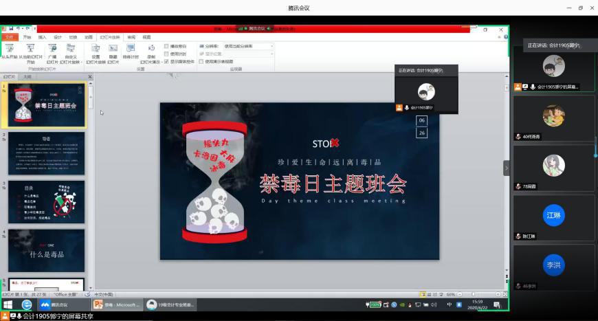 为加强校园的禁毒宣传教育工作,使同学们深入了解禁毒常识以及毒品的危害,树立防毒意识,提高自我保护能力。6月22日下午,会计1905班组织在腾讯会议开展了以“珍爱生命,远离毒品”为主题的班会教育活动,使学生增强自我防范意识,真正从行动上拒绝毒品。