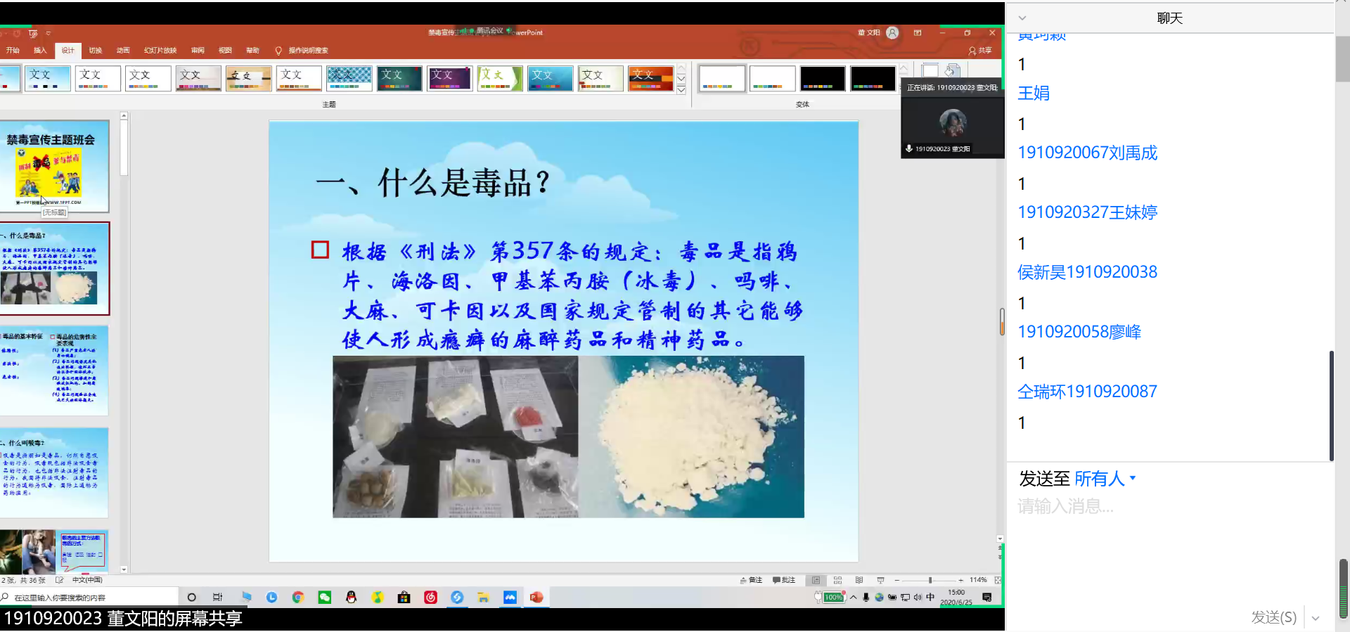 2020年6月26日是第33个国际禁毒日,为进一步加强同学们对毒品危害的认识。于下午15时,会计1903班由班长董文阳在腾讯会议app组织开展禁毒宣传教育主题班会,该会议紧扣“健康人生、绿色无毒”宣传主题,为同学们普及毒品预防的相关知识。
