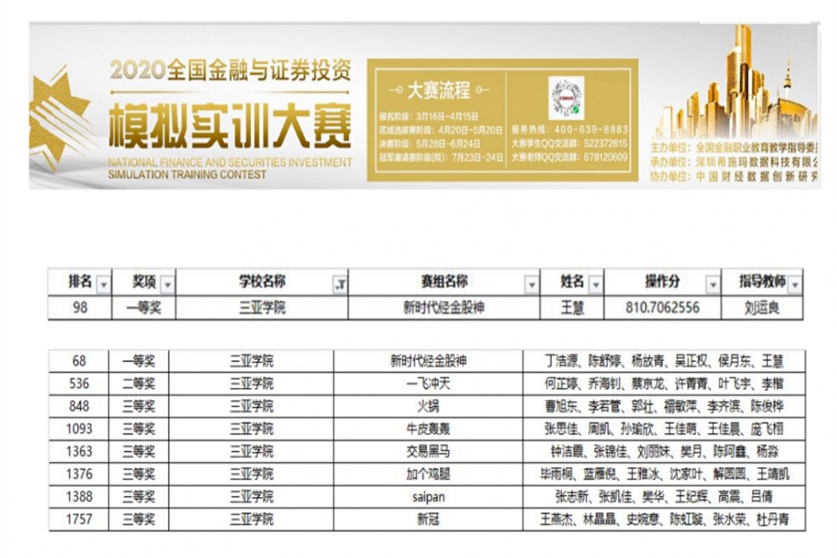 2020年7月16日,由全国金融职业教育教学指导委员会联合举办的全国金融与证券投资模拟实训大赛决赛落下帷幕。全国共有556所高职院校10660支代表队,63960人参加。我校财经学院9支代表队在经金专业刘运良老师的带领下参加总决赛。