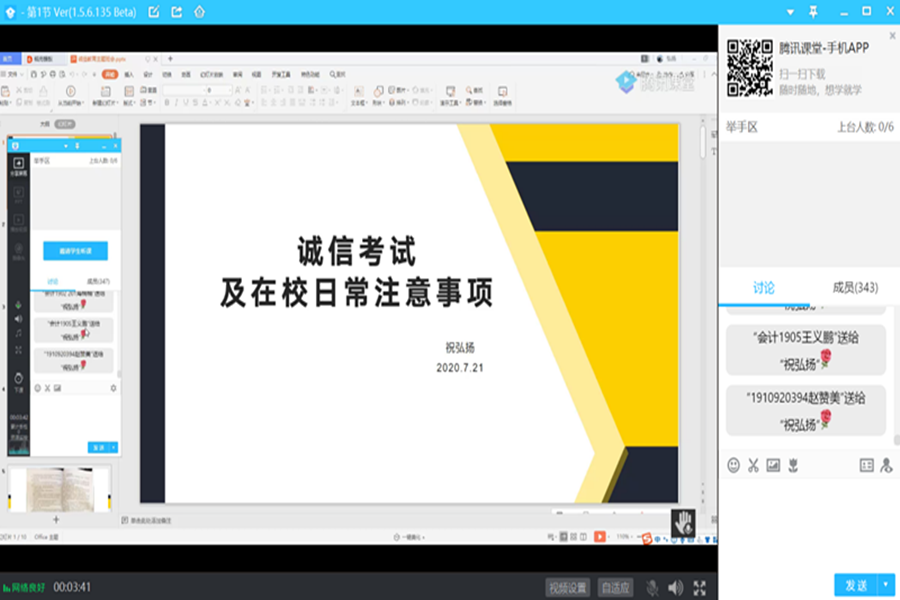 诚实守信向来是中华民族的优良传统,期末考试将至,为了严肃考场作风,让同学们做到诚信考试。7月21日下午15时,思想辅导师以线上的形式在腾讯课堂APP召开了“诚信考试及在校日常注意事项”的主题班会。